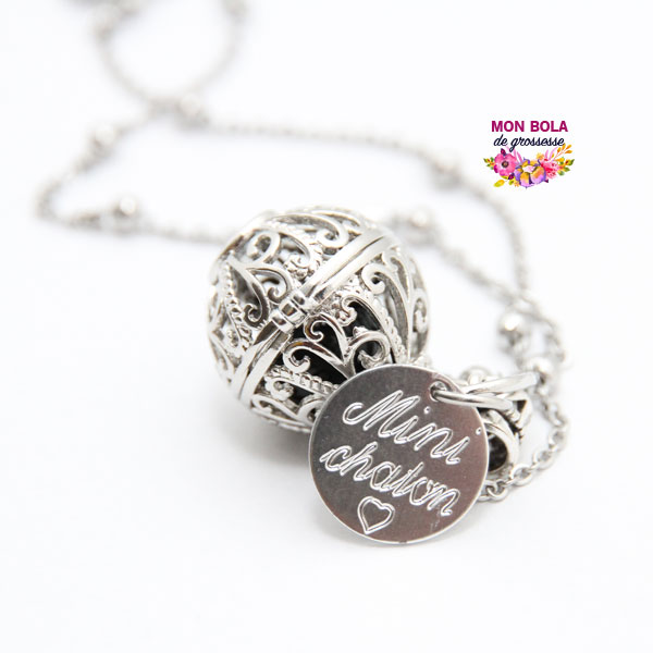 Voici un modèle de bola de grossesse qui tire son originalité de sa chaine inoxydable perlée. Associé à la solidité de l’inoxydable, ce design singulier et élégant donne à votre bola musical et gravé une touche contemporaine.
