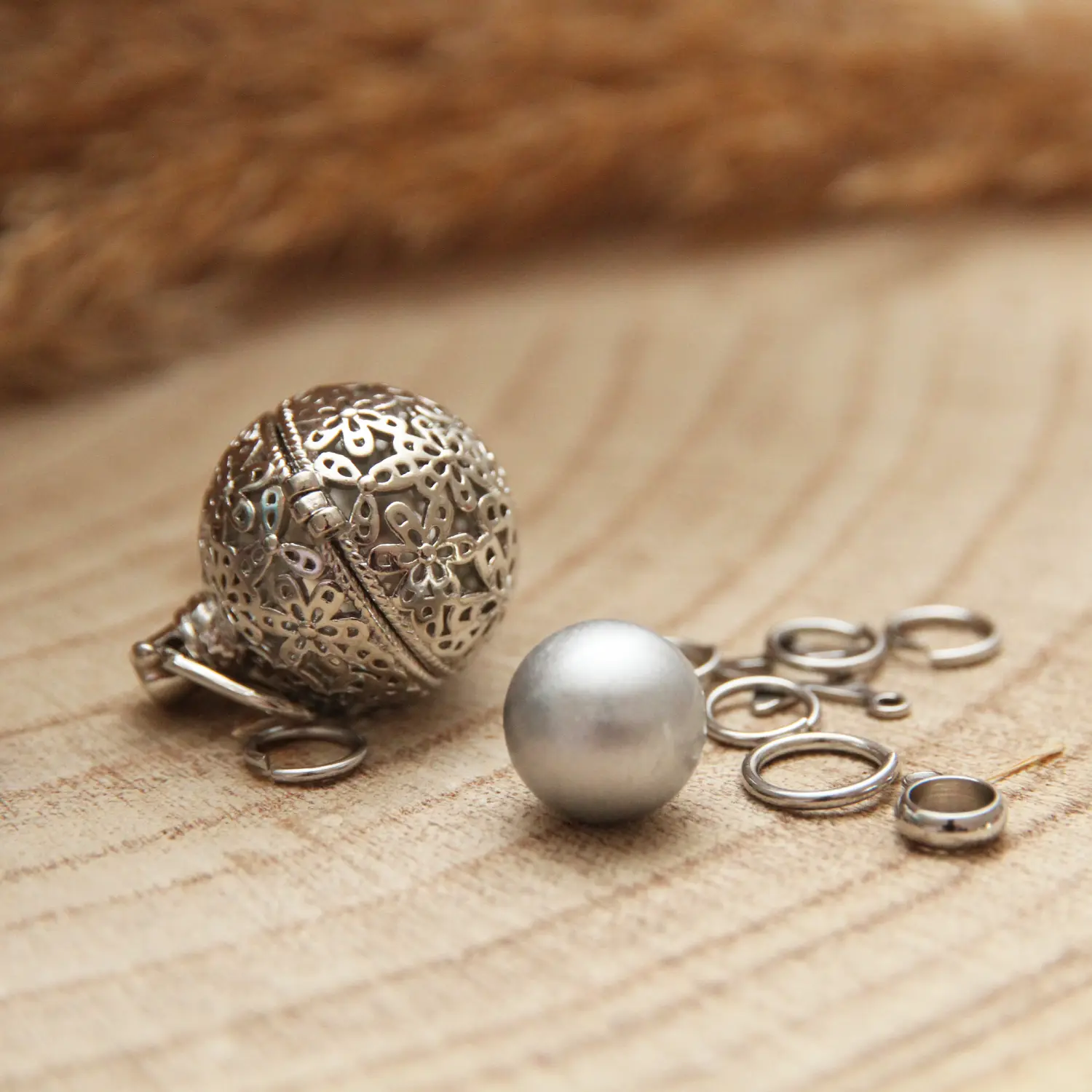 - une cage pendentif élégante abritant une petite bille sonore de 10mm au tintement apaisant,